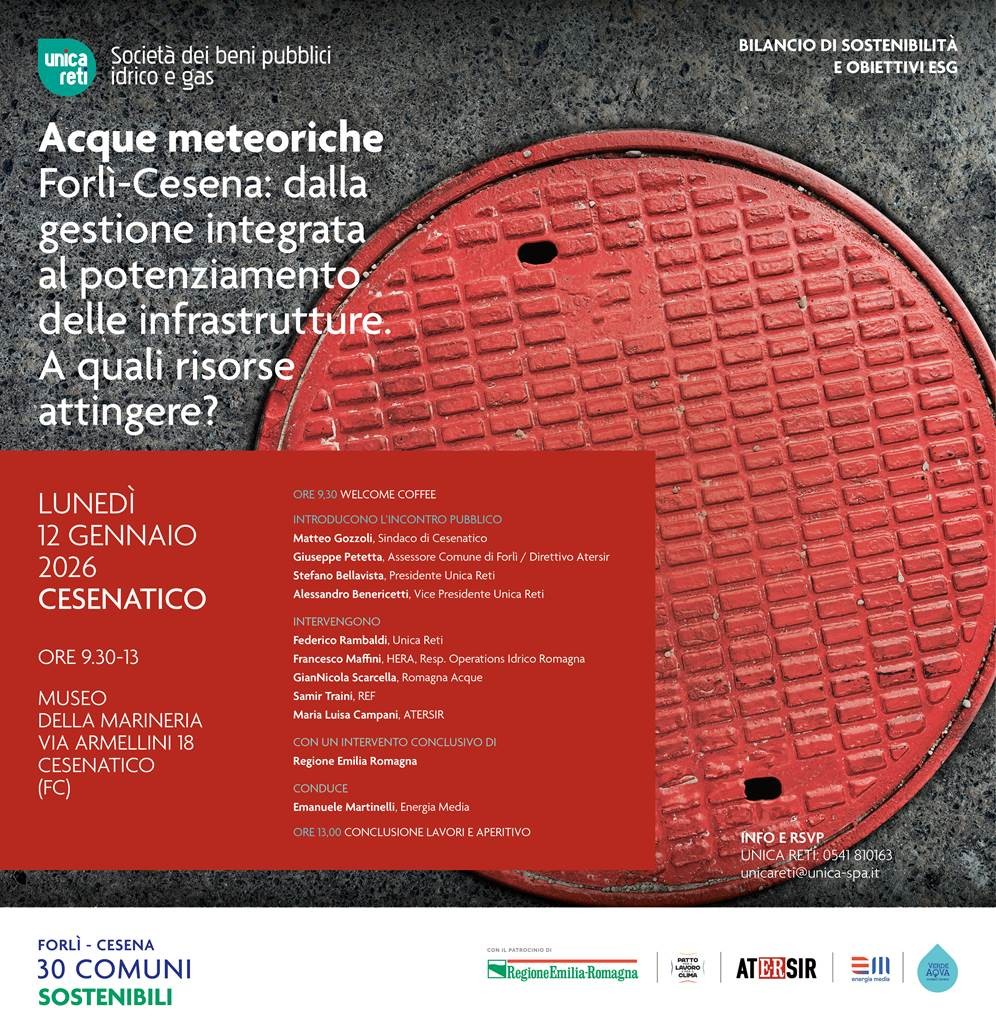 La capacità di Unica Reti di operare in stretta sinergia con i Comuni della Provincia di Forlì-Cesena è stata testimoniata negli anni dagli interventi di valorizzazione delle reti gas, acqua e illuminazione pubblica che sono andati a vantaggio di servizi a valore aggiunto per i cittadini. Durante il convegno di lunedì 12 gennaio – di cui troverete nella locandina il programma – oltre ai rappresentanti dei Comuni sarà una serie di esperti ad affrontare il tema – quanto mai attuale anche in questi giorni d’inizio anno – della gestione e del potenziamento delle reti per le acque meteoriche. Un appuntamento che avrà inoltre l’obiettivo di rendere pubblici i risultati del Bilancio di Sostenibilità di Unica Reti, con un focus sugli investimenti PNRR relativi alle “Acque meteoriche per Forlì-Cesena”; un BdS non atto formale ma d’indirizzo anche operativo con una proiezione sulle aspettative dei territori in termini di ulteriori interventi infrastrutturali da eseguire ed eventuali sottolineature riguardo a criticità rilevate dal territorio stesso sull’argomento. L’incontro servirà anche per una valutazione sul primo anno d’esperienza di gestione in forma integrata al Servizio Idrico Integrato (grazie a un doppio intervento a cura di Gruppo HERA e Unica Reti) con un aggiornamento dell’attività di ricognizione e di richieste relative all’Autorizzazione Unica Ambientale sugli scarichi in corso. Per comprendere pienamente il lavoro svolto negli anni da Unica Reti, paradigma di riferimento sul territorio nazionale, da sottolineare inoltre l’aggiornamento sul nuovo assetto delle reti idriche del territorio romagnolo, che dal 1° gennaio 2026 vedrà l’avvio della società patrimoniale unica delle province di Ravenna, Forlì-Cesena e Rimini grazie al conferimento delle reti in Romagna Acque; approfondimento utile inoltre per conoscere la programmazione degli interventi di investimento sui 3 ATO romagnoli. Non mancheranno infine momenti dedicati alla regolazione e alle risorse per finanziare i prossimi investimenti; un momento di confronto decisamente pragmatico con una disamina sugli interventi per il potenziamento e l’adattamento dei sistemi di drenaggio in agglomerato urbano.